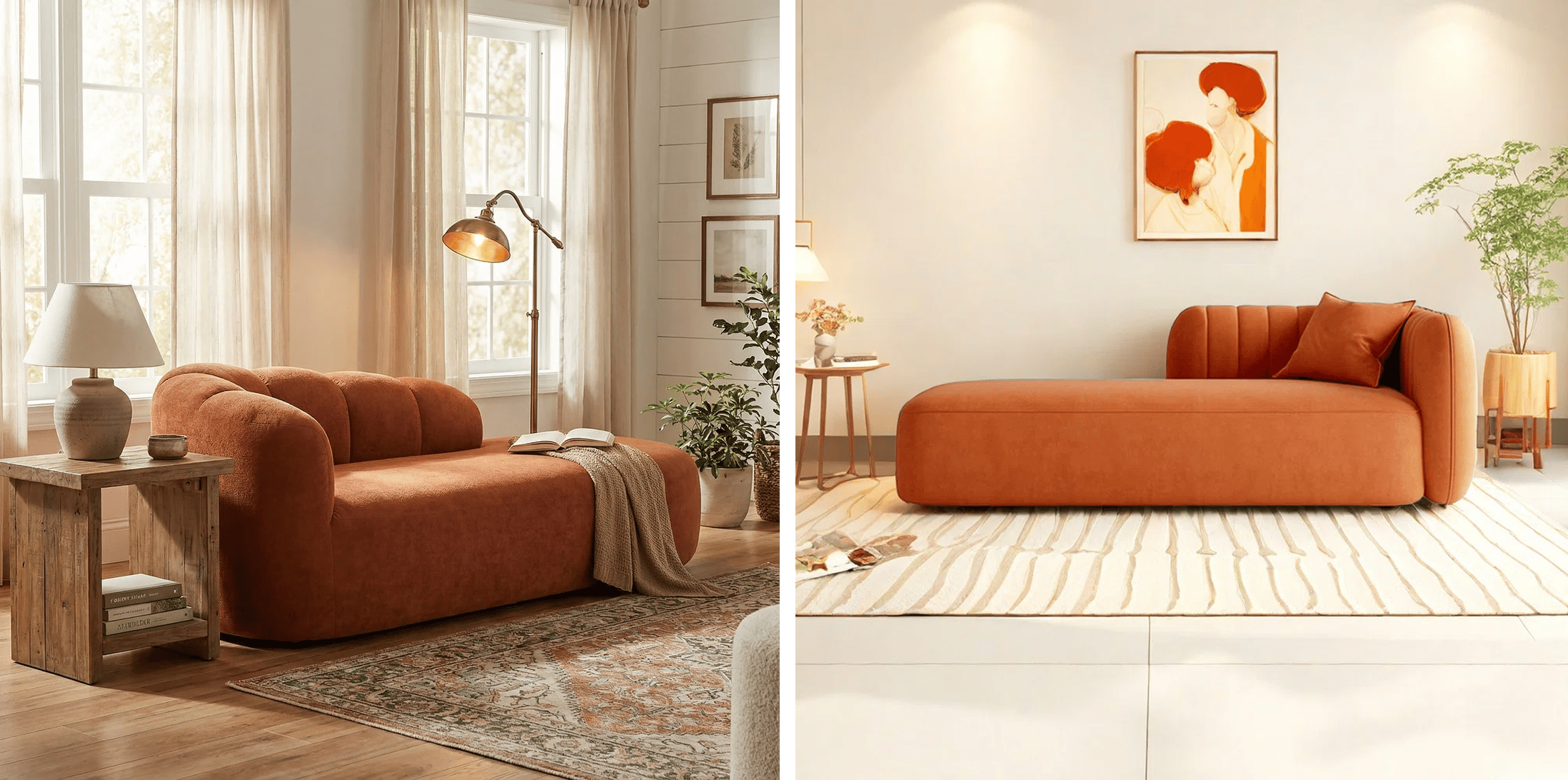 Proof that one standout piece can change the whole room: this curved rust sofa is doing all the heavy lifting. Add a vintage rug, warm wooden furniture, and a sculptural lamp for an on-trend lounge situation.